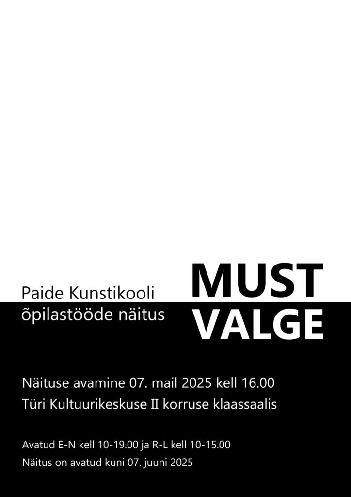 7. mail kell 16.00 avame Türi Kultuurikeskuse II korruse klaassaalis näituse MUSTVALGE. Üleval on Paide Kunstikooli kuuenda ja seitsmenda klassi looming. Näitus jääb avatuks kuni 7. juuni 2025.